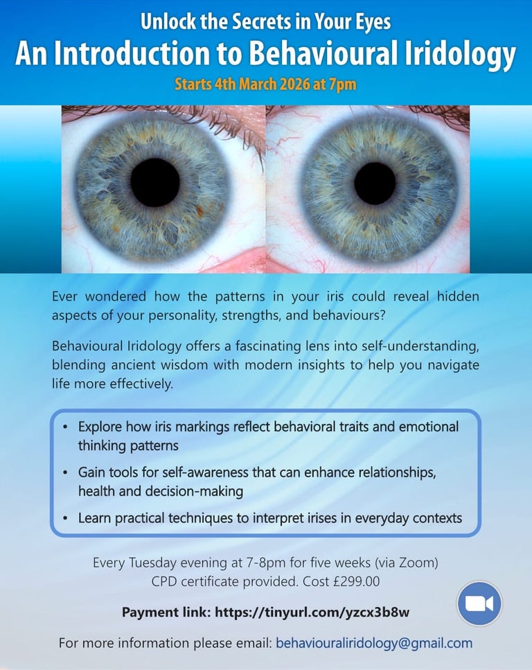 For full details or to reserve your place, email: info@behaviouraliridology.com